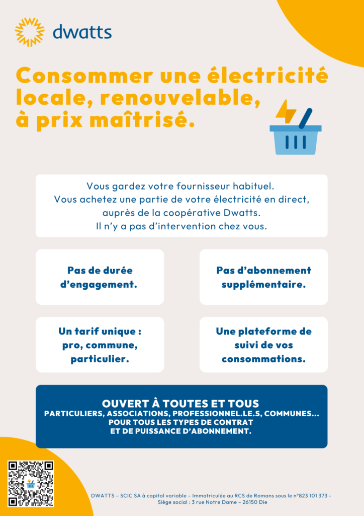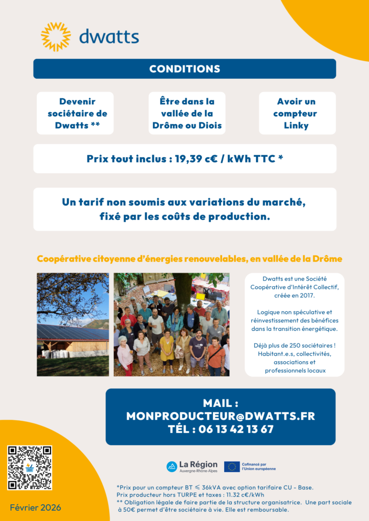 Qu’elle soit produite par Dwatts ou par votre voisin « petit producteur », cette électricité locale et renouvelable, est donc vendue en circuit court, directement du producteur au consommateur. Elle est protégée des aléas du marché de l’électricité. Le prix de vente est déterminé uniquement par les coûts de production et de gestion. Leurs montants sont connus et prévisibles à long terme.