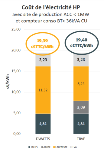 Si on ajoute le prix d’utilisation du réseau public d’électricité et la TVA, on obtient un prix de vente total (pour un compteur < 36 kVA et en option base) : 19,39 c€/kWh. Il s’agit d’un tarif légèrement inférieur au tarif bleu d’EDF, comme l’illustre le graphique ci-contre.